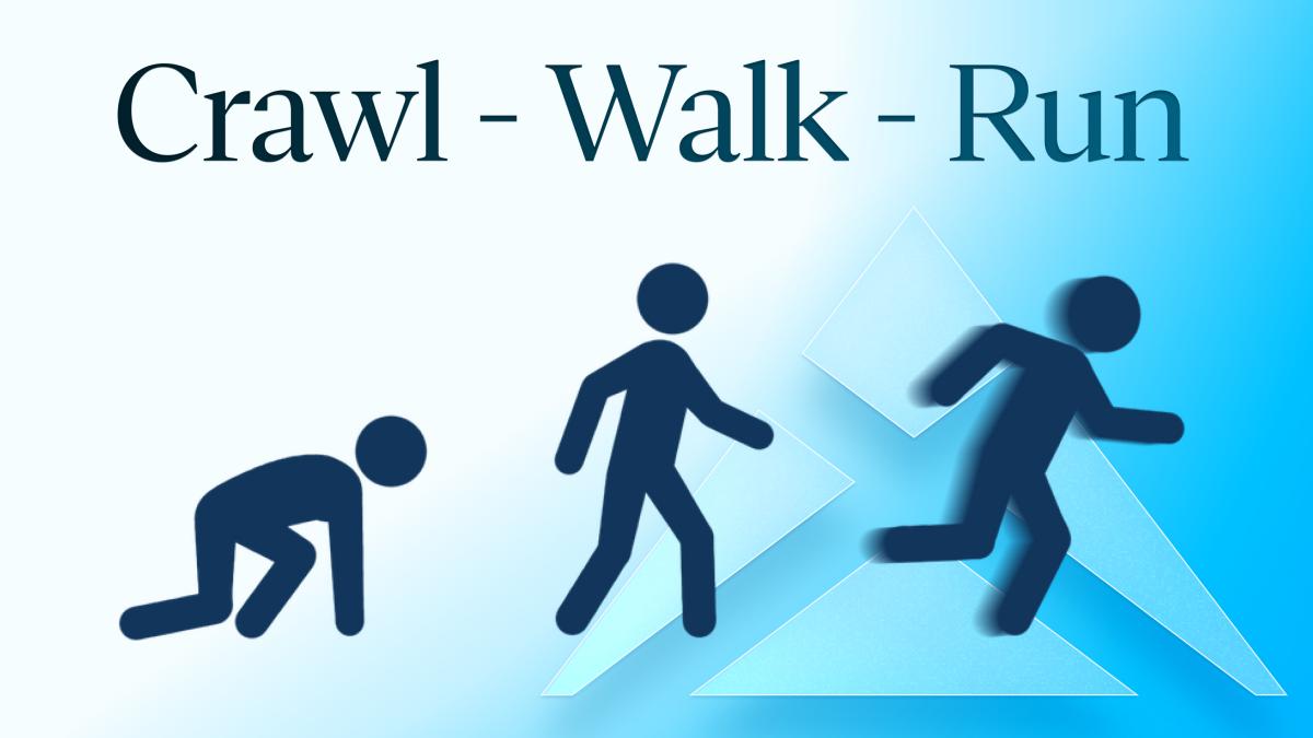 Crawl – Walk – Run describes the step-by-step path to successful AI adoption. Companies start with small tests, then deliberately integrate AI into processes, and ultimately reach fully automated, scalable usage. This creates sustainable progress instead of chaos caused by rushed decisions.
