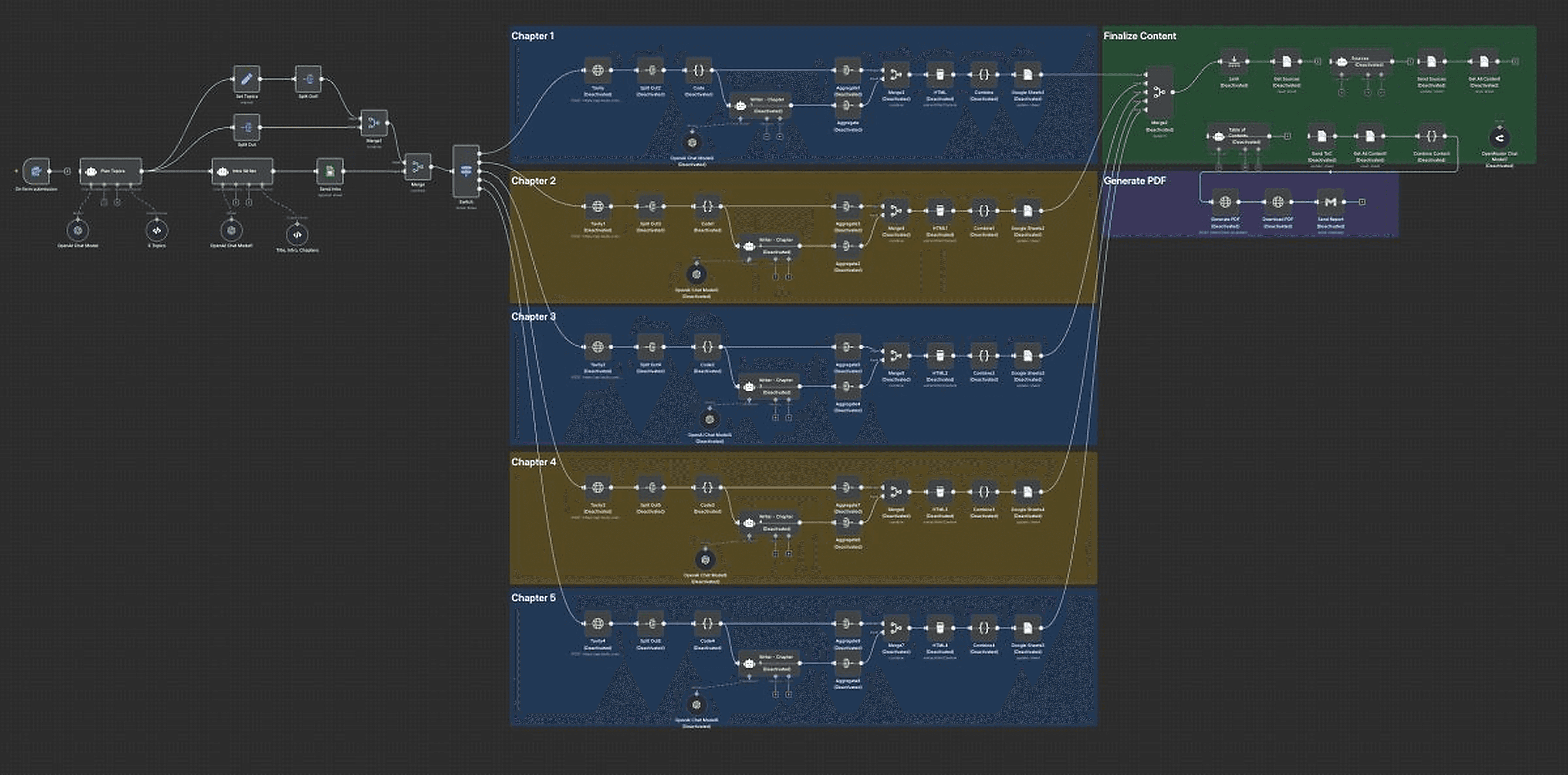 An APEX n8n workflow for the automated creation, structuring, and output of multi-chapter documents, including topic breakdown, chapter generation with GPT, HTML, and Google Sheets export, and final PDF creation.