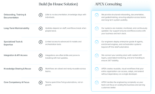 The build vs. buy debate is less about technology and more about time. Every month spent building and debugging internal AI systems is a month not spent on customers, revenue, and growth. For most companies, the smarter move is partnering with experts who've already made the mistakes, built the frameworks, and know what works. Keep internal resources focused on what your business actually does best, and let specialists handle the rest.